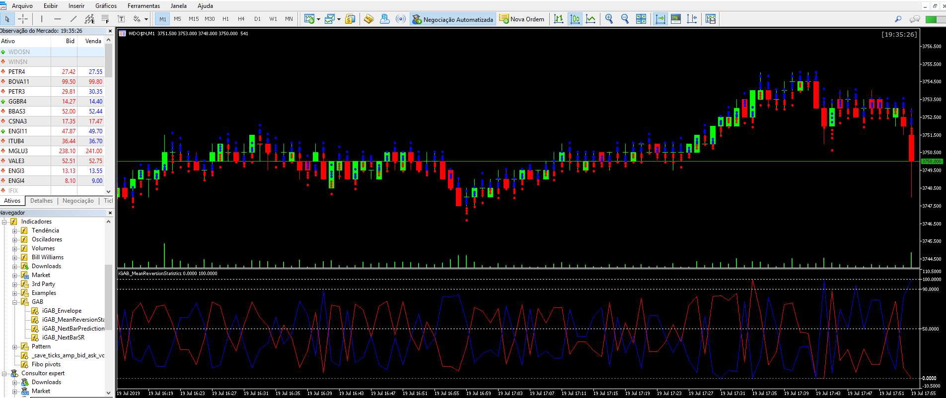 Preciso saber de Python? Pra ser sincero, qualquer linguagem de programação já serve, embora C/C++ e Python sejam as mais comumente empregadas. Matlab e R são excelentes companheiros para prototipagem rápida. Metatrader é outra ferramenta interessante. Na figura abaixo temos um preditor de faixas de preços para o período seguinte e um indicador de probabilidade de sucesso de reversão à média computado usando histórico de dados.